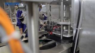 Automatic in-line machine “Pastpack L” is designed for dose filling liquid and pasty products containing soft, easy deformable additives of up to 10 mm in plastic cups with their further sealing with aluminum varnished foil and capping. In-line m...