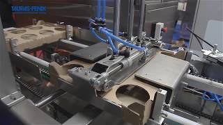 Tray packer is designed for automatic tray/tray with slots forming from corrugated cardboard as a part of automatic processing lines as well as with manual product placing in tray.
