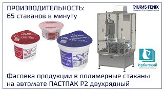 Автомат упаковки продуктов в пластиковую тару в два ручья. Купить оборудование с возможностью фасовки двух видов продукции в один стакан или контейнер.